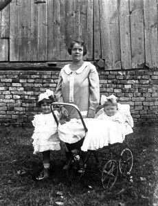 Kobieta z dziewczynką i dzieckiem w wózku.