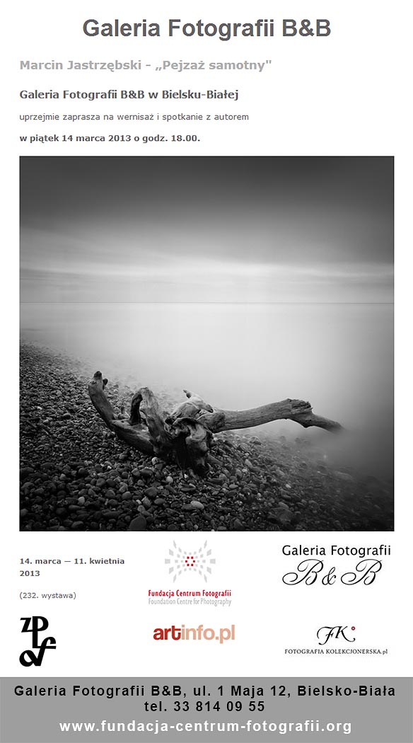 Zapraszamy na wystawę Marcina Jastrzębskiego „Pejzaż samotny” do Galerii Fotografii FOKUS Miejskiego Ośrodka Kultury w Siedlcach. Wernisaż wystawy odbędzie się 24-go kwietnia , o godzinie 18:00 w Galerii FOKUS przy ul. Pułaskiego 7 w Siedlcach. Wystawa będzie czynna od 25.04 do 16.05.2014 r. Zapraszamy!