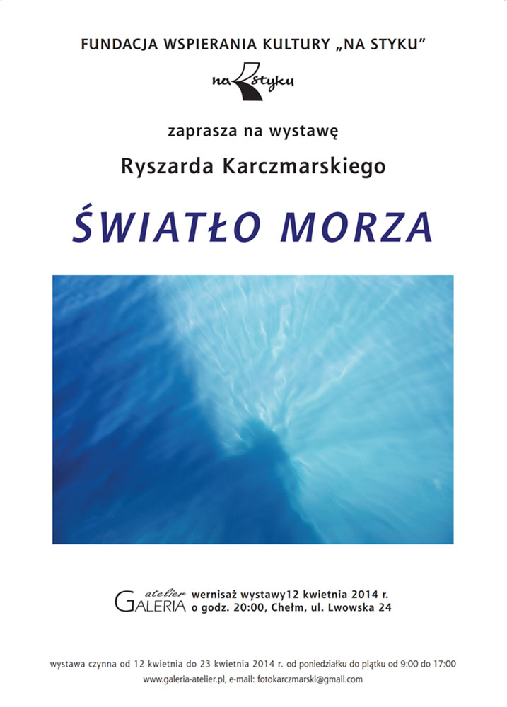 Fundacja Wspierania Kultury „Na Styku” zaprasza na wystawę fotografii Ryszarda Karczmarskiego pt. „Światło morza”. Wernisaż wystawy odbędzie się dnia 12 kwietnia 2014 r. o godzinie 20:00 w Galerii Atelier, ul. Lwowska 24, Chełm.
