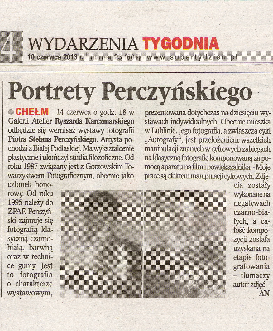 „Autografy” Piotra Perczyńskiego w Galerii Atelier, Chełm, ul. Lwowska 24. Wernisaż wystawy 14 czerwiec 2013 r., godzina 18:00. Wystawa odbedzie sie w ramach obchodow jubileuszu 10 lecia Okregu Lubelskiego ZPAF. Wystawa czynna będzie do połowy lipca. Serdecznie zapraszamy!