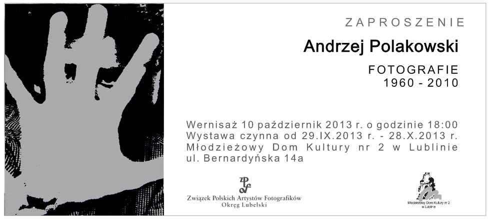 Serdecznie zapraszamy na Jubileuszową wystawę fotografii Andrzeja Polakowskiego pt. Fotografie 1960 – 2010. Wernisaż wystawy odbędzie się dnia 10 października 2013 r., o godzienie 18:00 w MDK nr 2 przy ul. Bernardyńskiej 14a w Lublinie. Wystawa będzie czynna od 29.IX.2013 do 28.IX.2013. Zapraszamy!