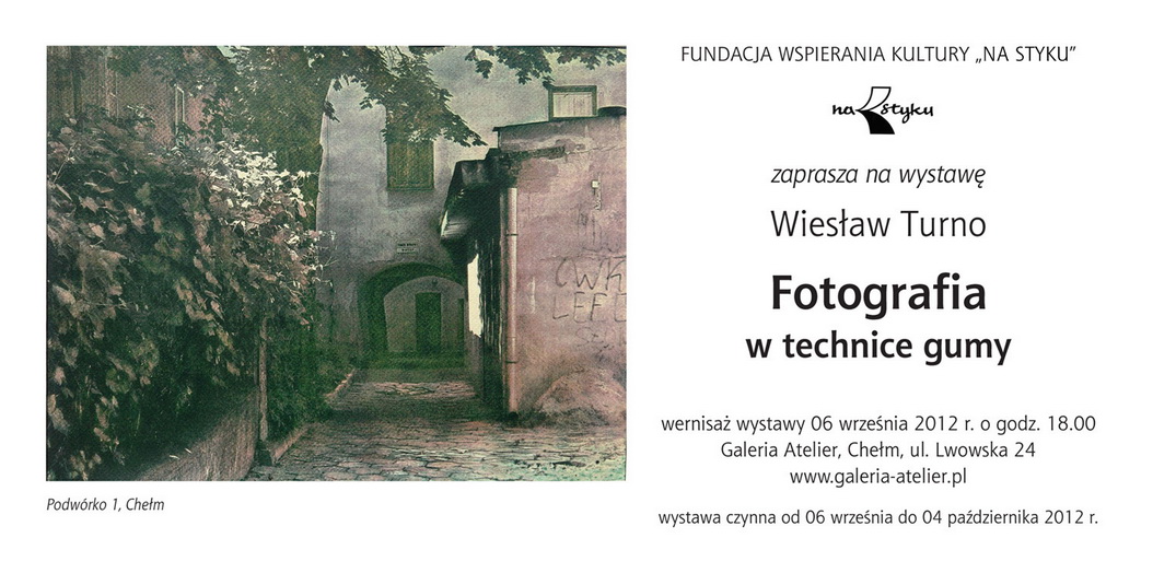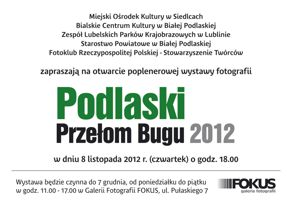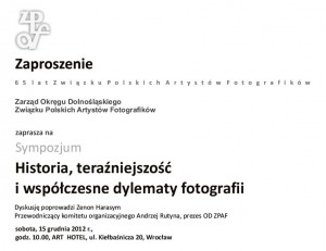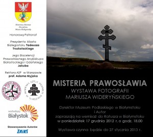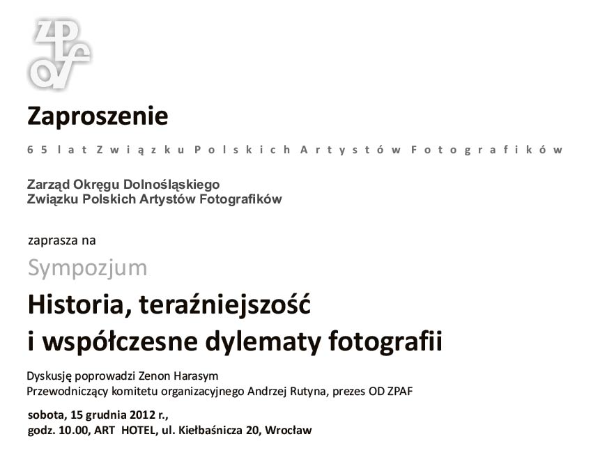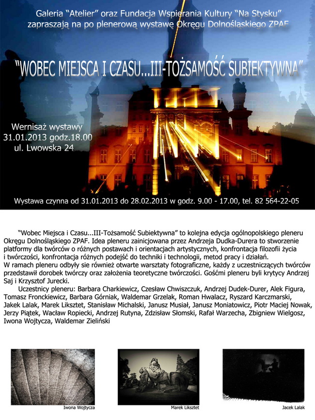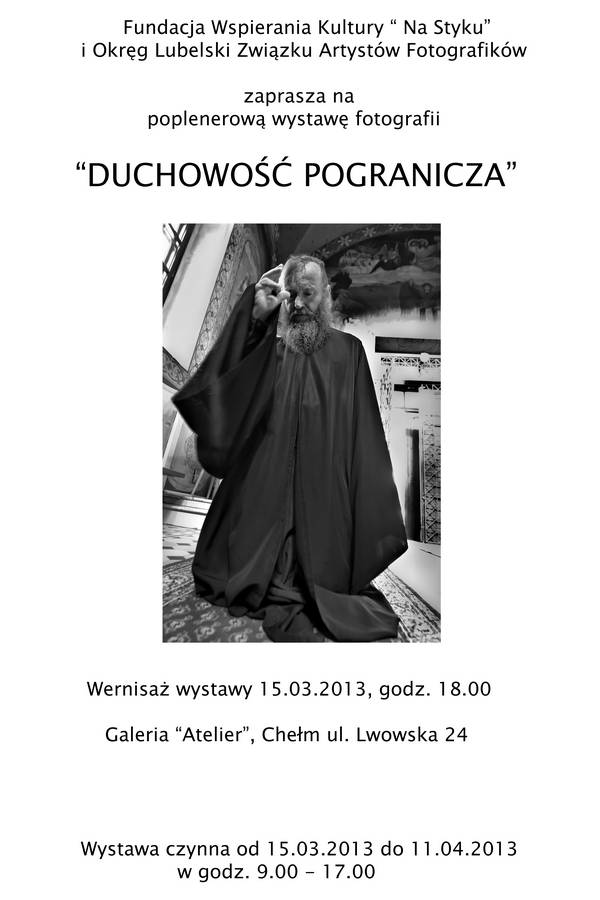 Fundacja Wspierania Kultury i Okreg Lubelski Zwiazku Artystow Fotografikow zaprasza na wernisaz wystawy fotografii ,,DUCHOWOSC POGRANICZA,, 15 marzec 2013 r.godz 1800 , wystawa czynna do 11kwietnia.Wystawa odbedzie sie w ramach obchodow jubileuszu 10 lecia Okregu Lubelskiego ZPAF