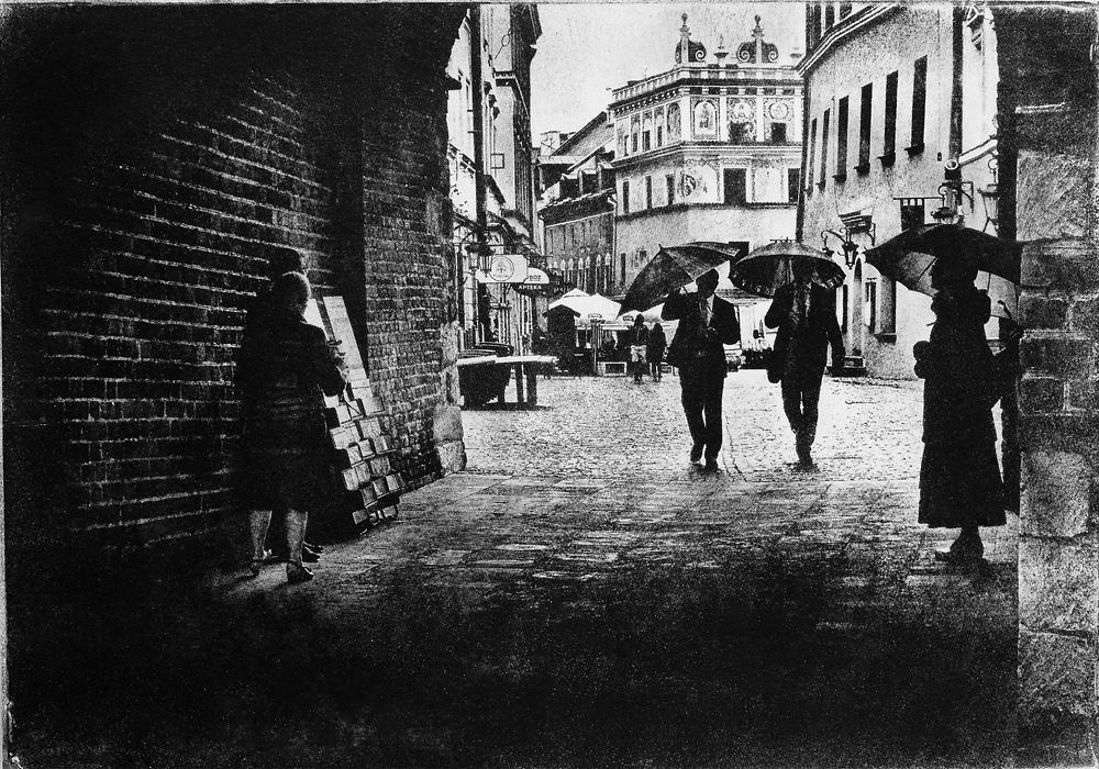 …Kontynuatorem tradycji lubelskiej fotografii, szczególnie tej skupionej wokół idei piktorializmu miejskiego jest Robert Pranagal. Artysta pracuje w tradycyjnej, szlachetnej, technice olejowej, która była popularna w początkach XX wieku wśród piktorialistów. W wyniku procesu fotografowania i czasochłonnego, ręcznego tworzenia odbitek osiąga niepowtarzalny efekt dzieła o cechach malarskich bliskich idei piktorializmu. Z mgły, powidoku, szerokiej perspektywy wyłania się czarno-biały klimatyczny obraz miasta. Lublina zawieszonego w czasie, pozornie odległego, a przy bliższym oglądzie bliskiego i współczesnego…