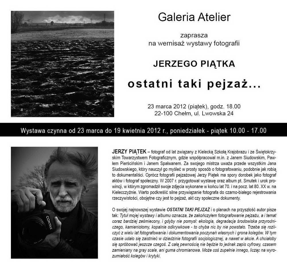 Zapraszamy na wystawę fotografii Jerzego Piątka pt. „ostatni taki pejzaż…”. Wernisaż wystawy odbędzie się 23 marca, o godzinie 18:00 w Galerii Atelier, ul. Lwowska 24, Chełm. Wystawa czynna będzie od 23 marca do 19 kwietnia 2012 r.